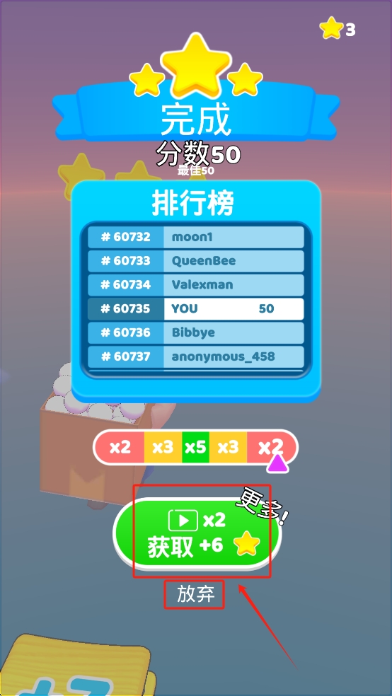 4、达成通关条件:根据不同关卡要求,可能需要收集指定数量星星或达到特定小球数量才能通关。