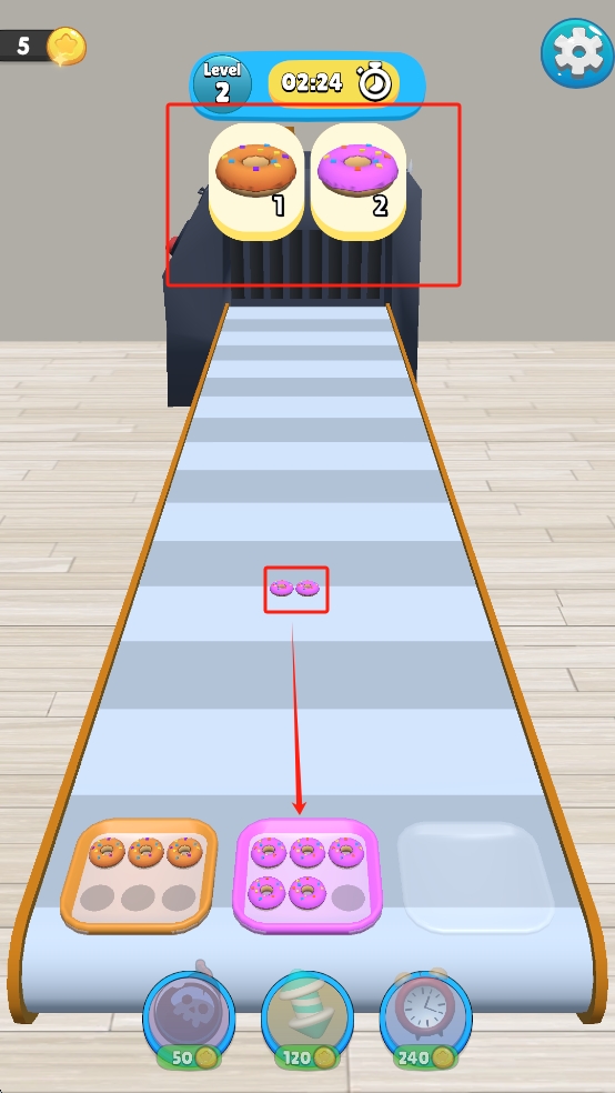 2、合成升级规则:3个同等级商品自动合成1个高等级商品,最高可合成至5级。合理规划托盘空间是通关关键。