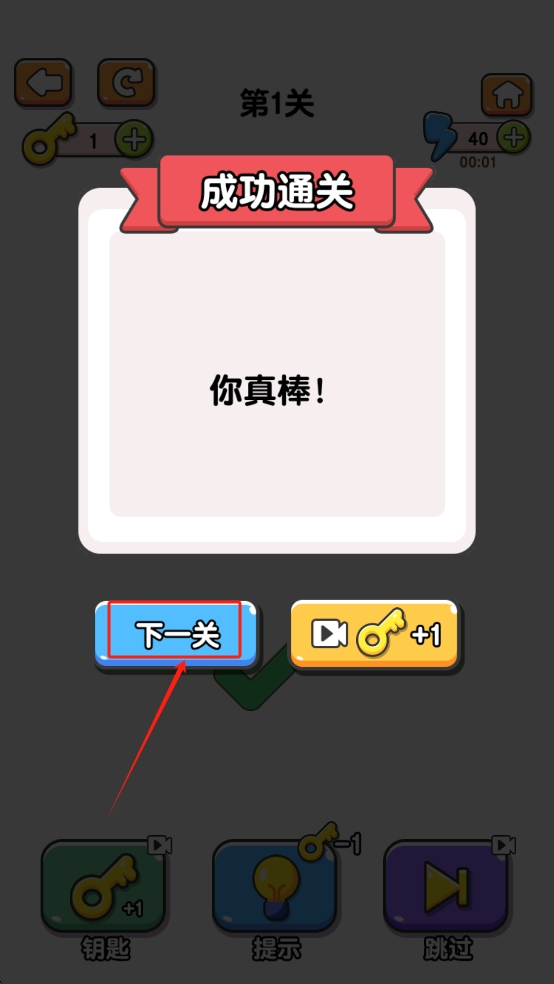 4、最后,完成关卡后点击“下一关”继续游戏。