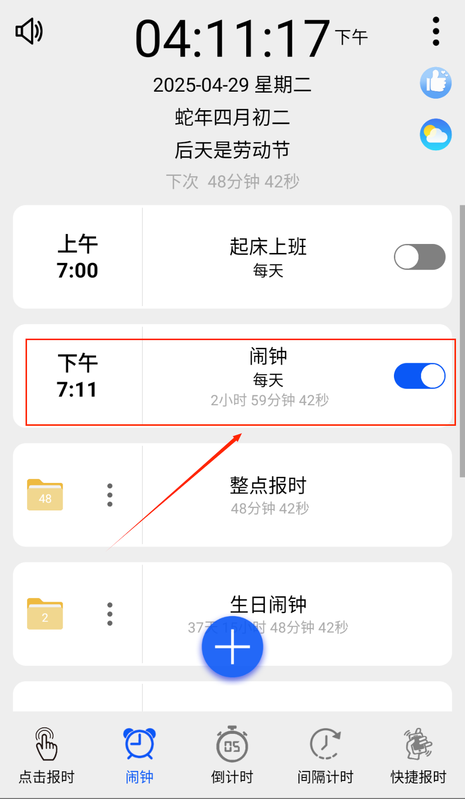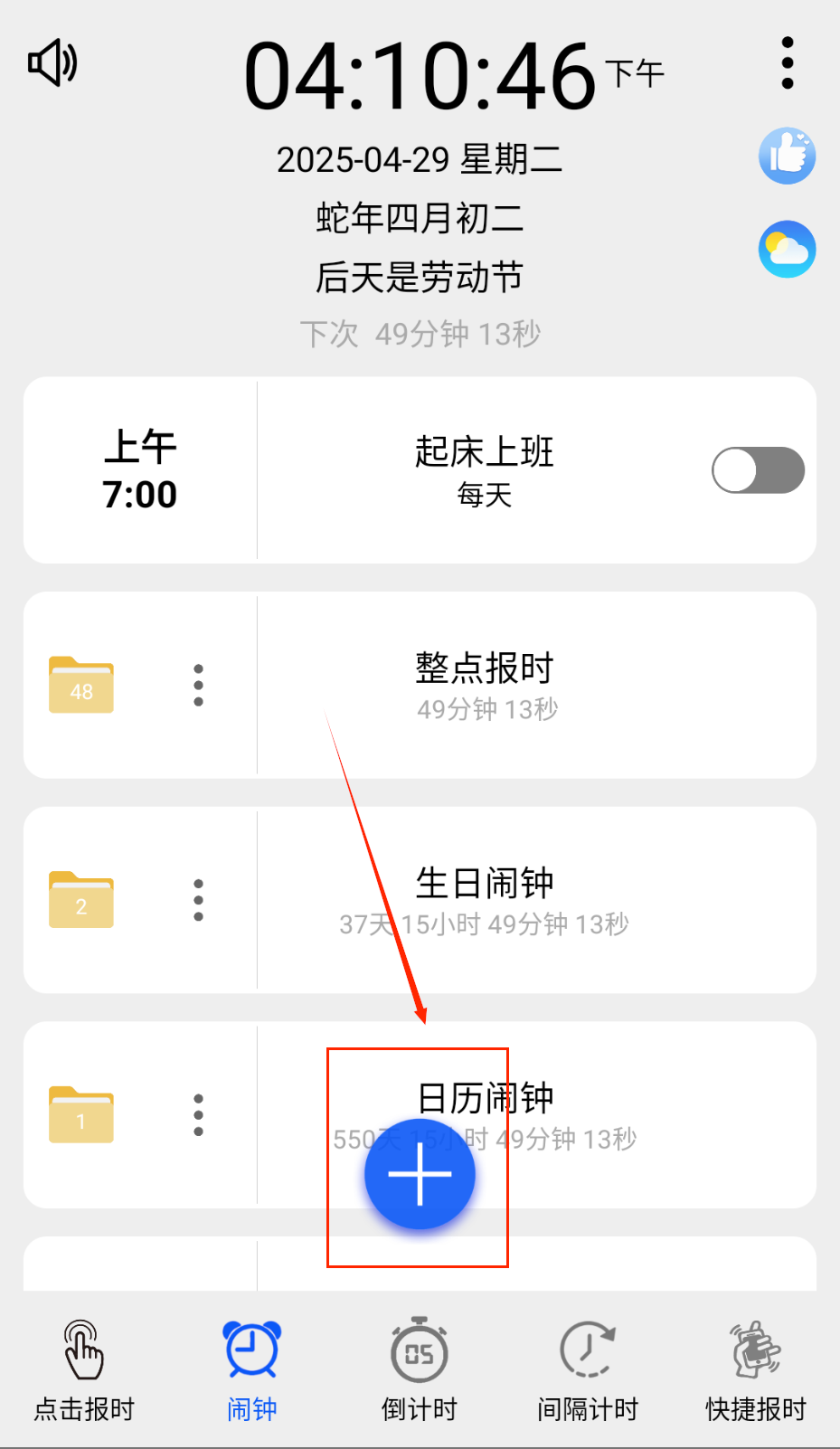 1、打开应用点击界面右下角加号图标,进入时间设定页面。