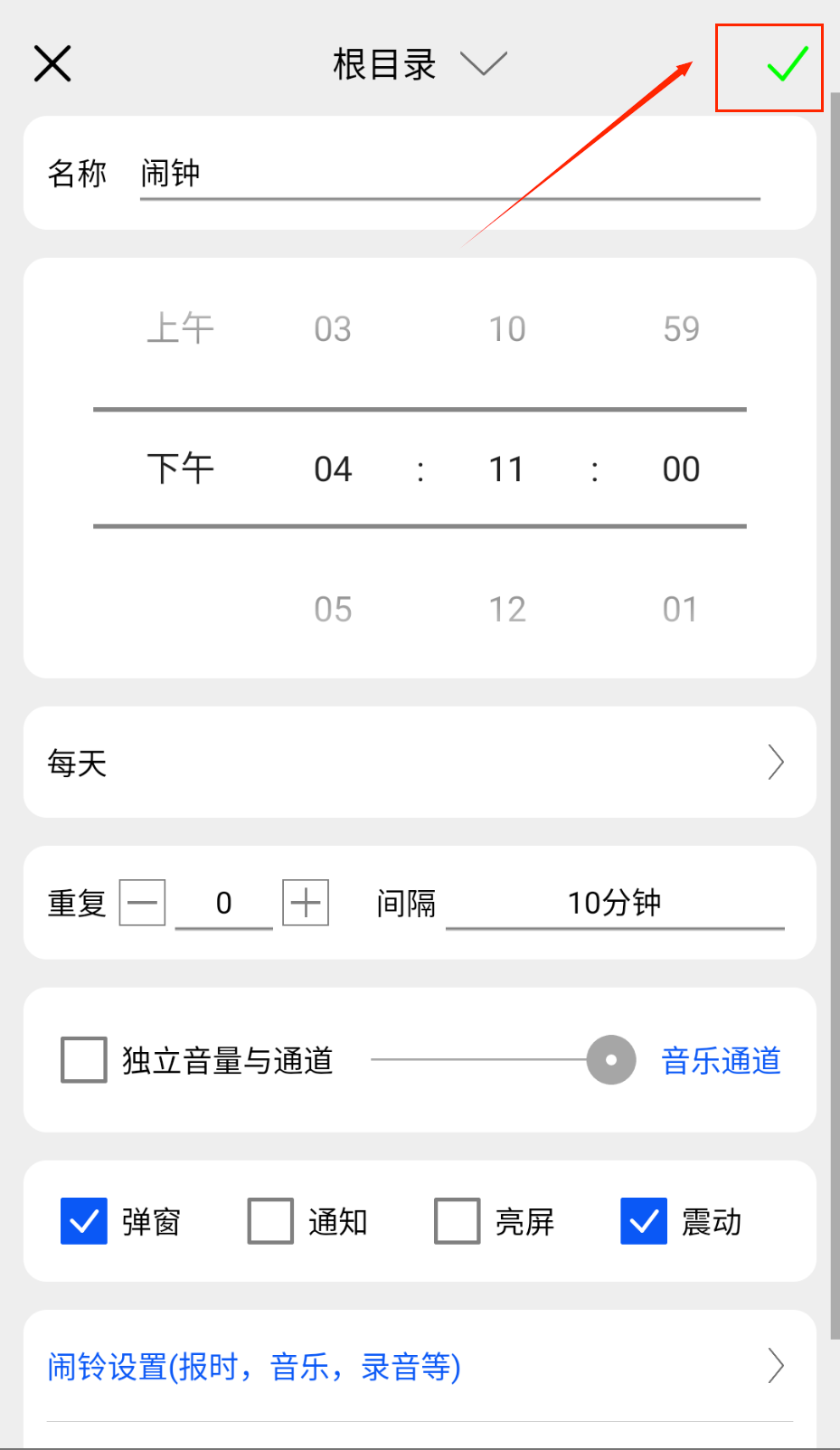 2、滑动时间滚轮选择具体时刻,通过底部勾选按键确认保存。