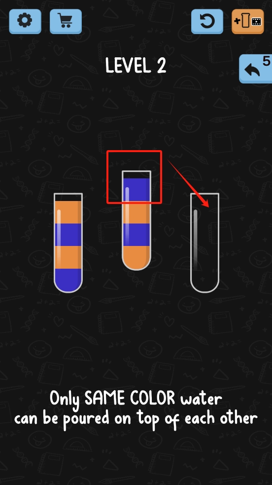 1、基础操作:点击选择装水的容器,再点击目标容器即可倒水。注意只能将颜色倒入相同颜色或空容器中。