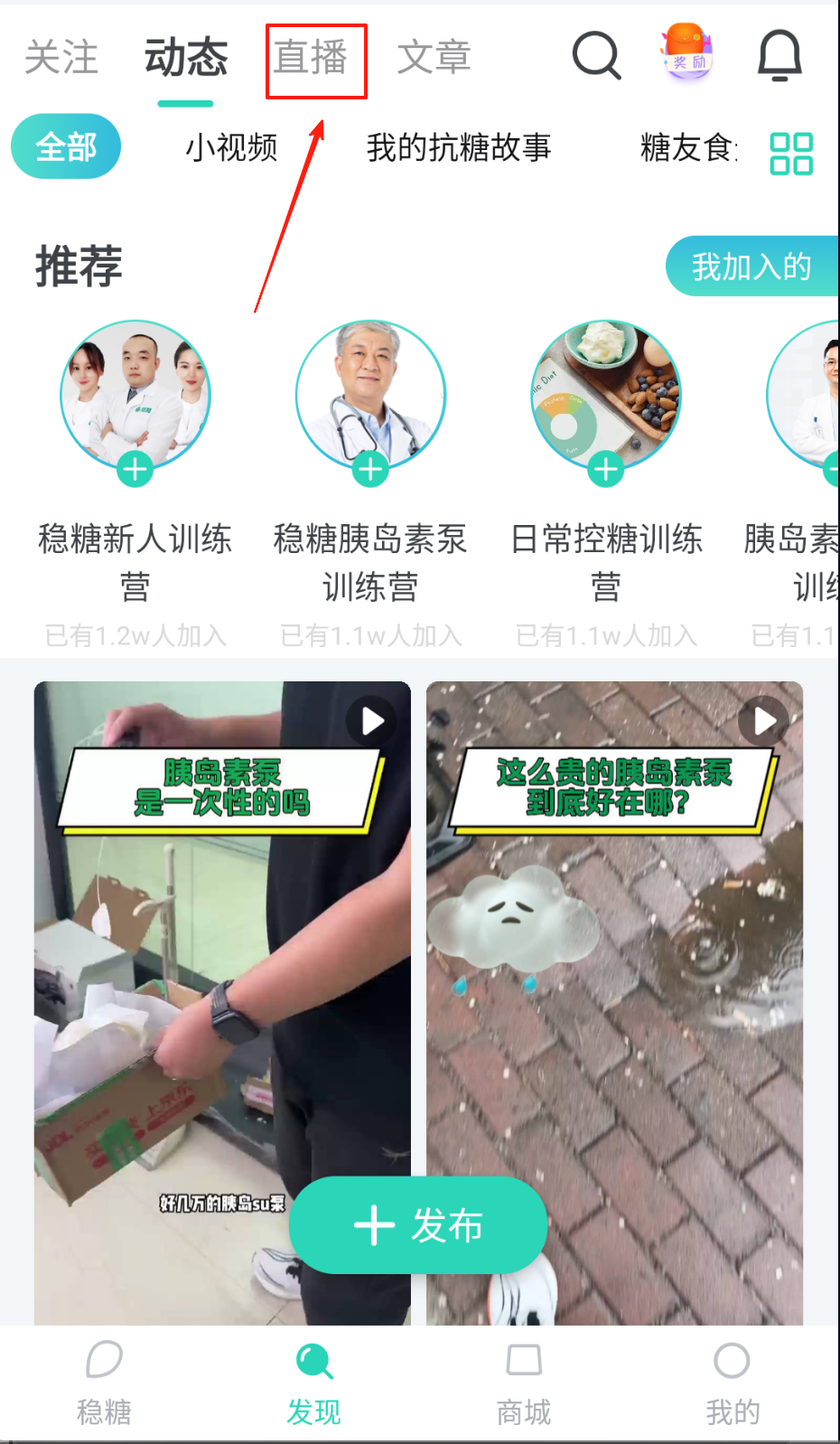 3、进稳糖社区看大咖直播,学习胰岛素泵使用技巧和运动控糖经验。
