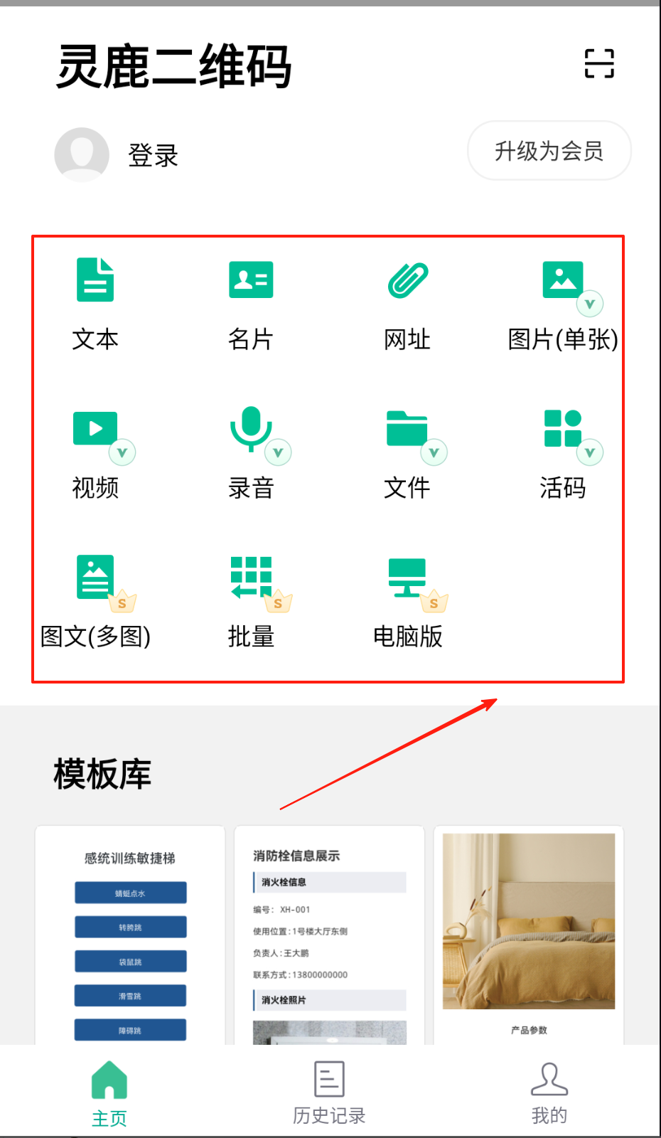 1、点击首页生成按钮,选择视频或名片类型输入对应信息即可创建专属二维码。