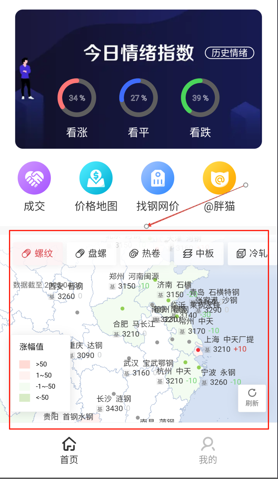 1、下载安装后完成注册登录,首页默认展示区域价格分布图。