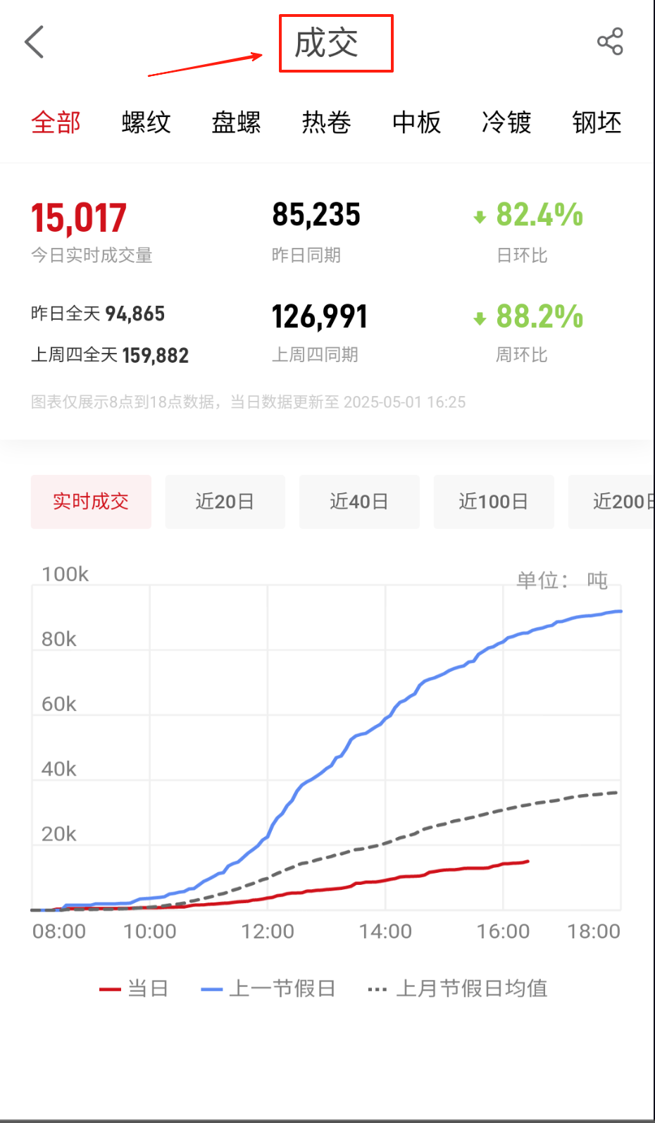 2、点击成交板块查看当日交易明细,滑动筛选不同钢材品类与规格数据。