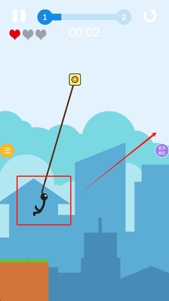 2、控制绳索摆动:点击屏幕射出绳索,通过左右倾斜设备控制摆动幅度和控制好方向。