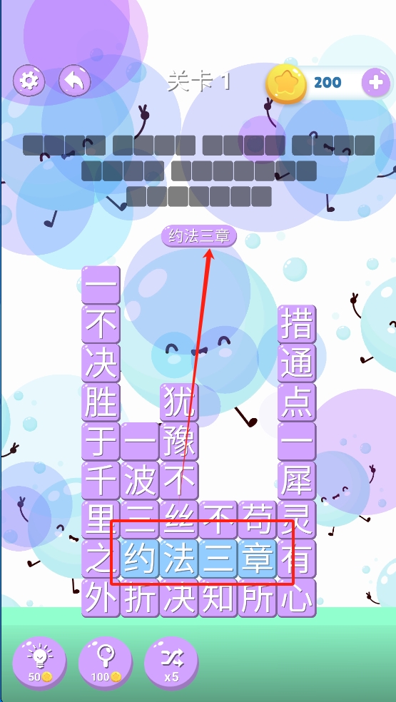 3、在关卡中,通过匹配正确的成语来消除方块。