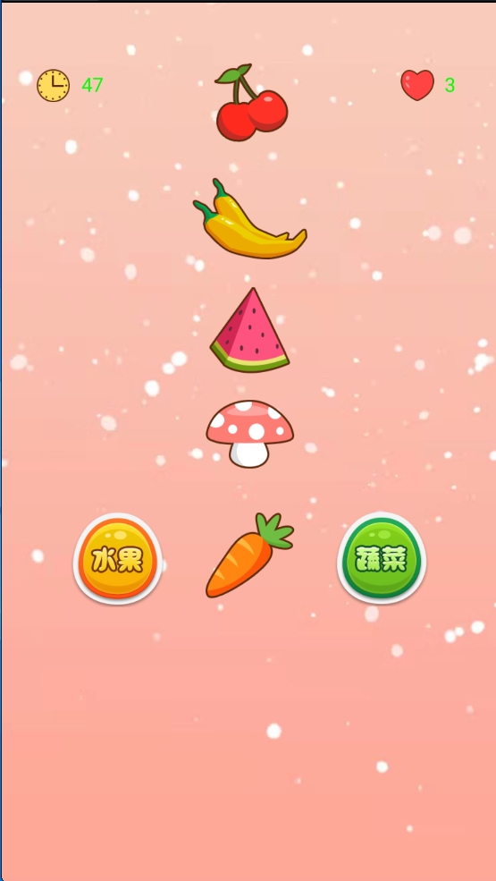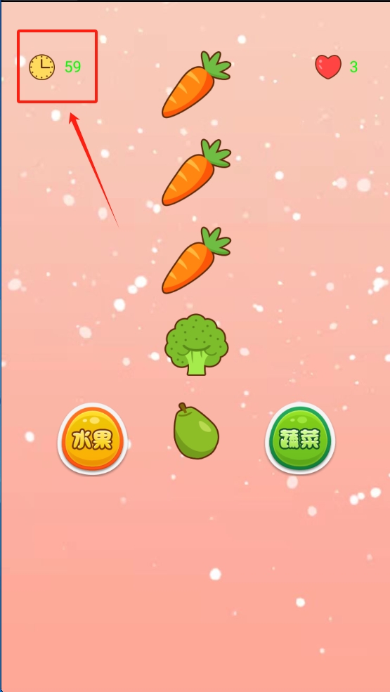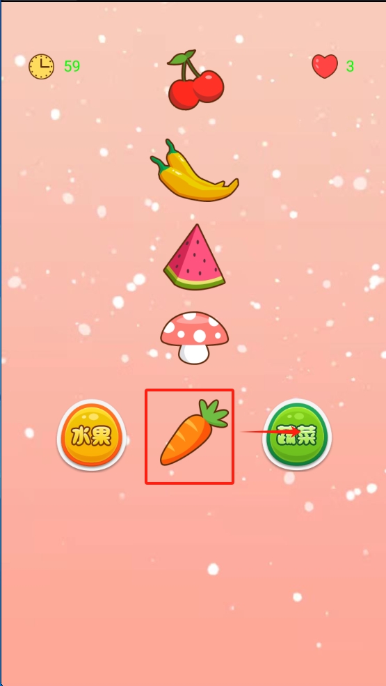 2、根据下落的物品判断是水果还是蔬菜,并选择相应的按钮。