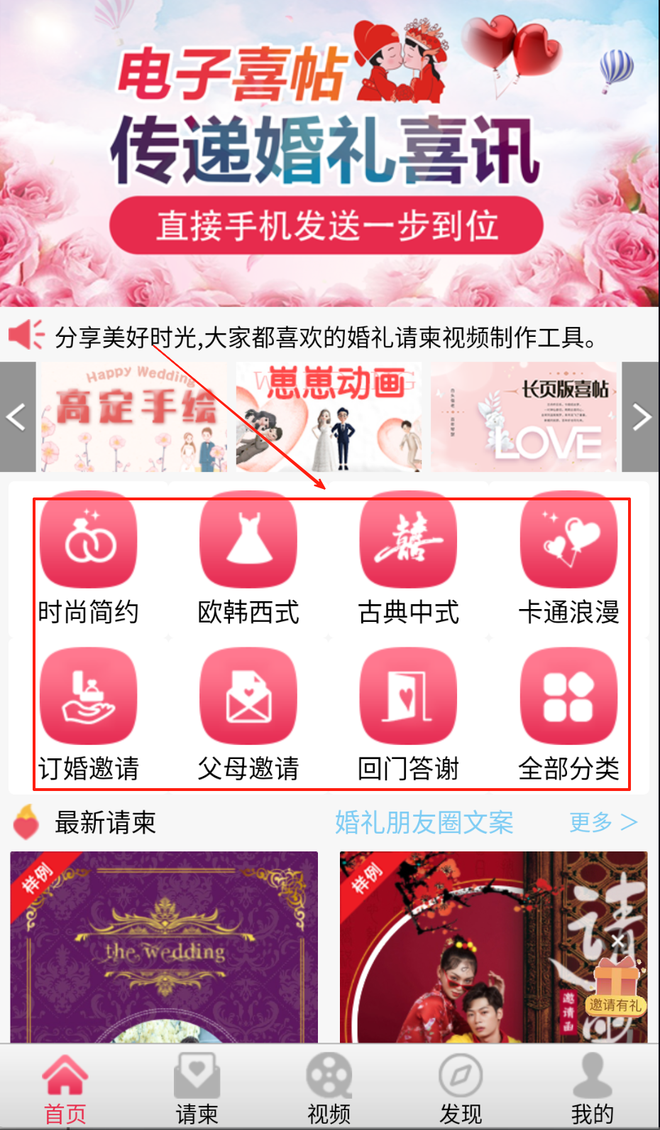 1、安装应用后选择需要的请柬类型,根据场景挑选对应模板进行创作。
