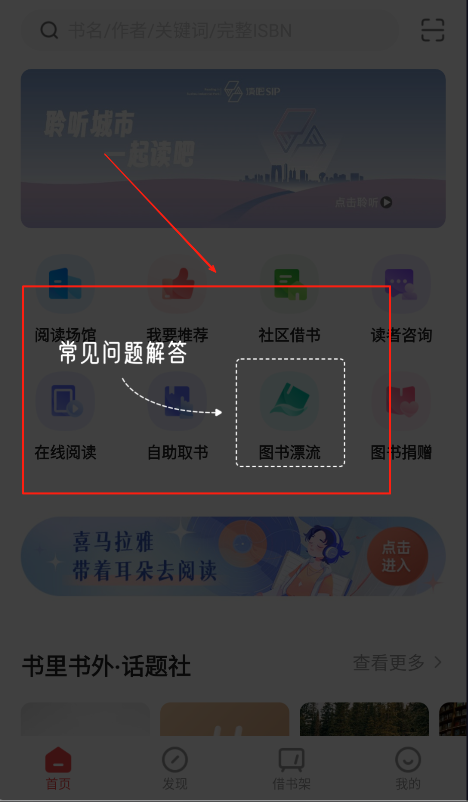 2、首页中部有“在线阅读”“图书漂流”八个功能按钮,点击“喜马拉雅”能听书,红色框里的“常见问题解答”记得看看。
