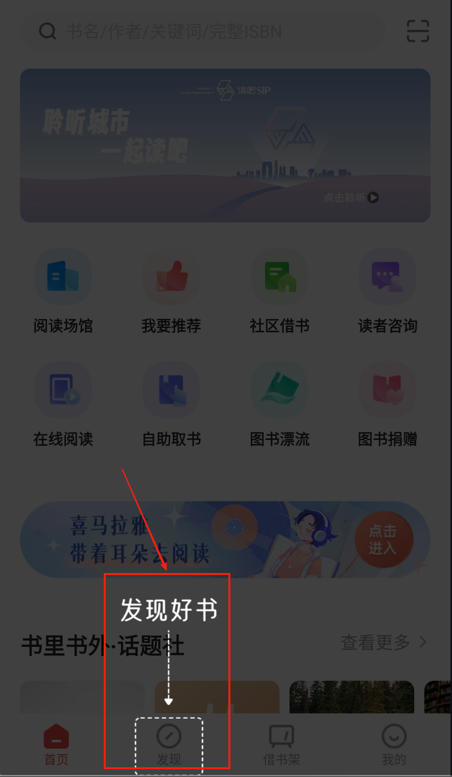 3、底部导航栏切换“发现”页能找到读书活动。