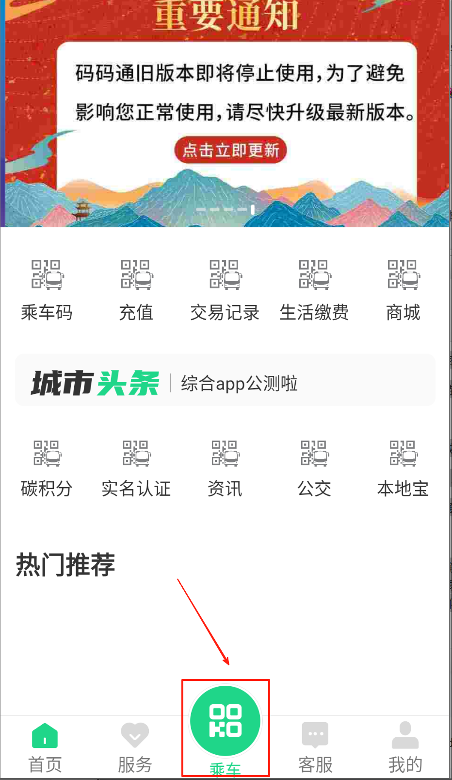 2、进入首页选择扫码乘车功能,手动刷新生成动态乘车码。