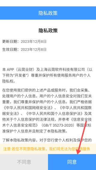1、打开软件,根据相关隐私政策,点击【同意】按钮。