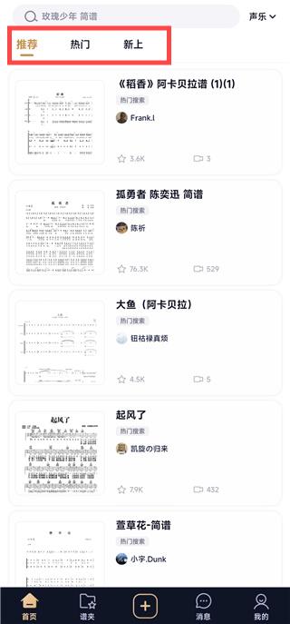 1、打开软件,进入首页后,可以选择推荐、热门、新上的乐谱。