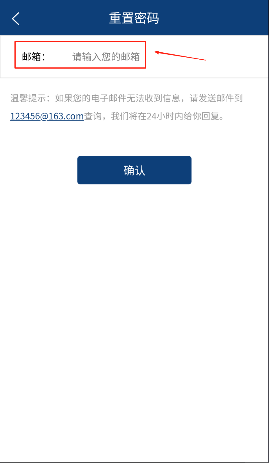 1、进入重置密码界面填写注册邮箱,若收不到验证信息可发送问题至[email protected],耐心等待24小时内人工回复后点击确认按钮继续操作。