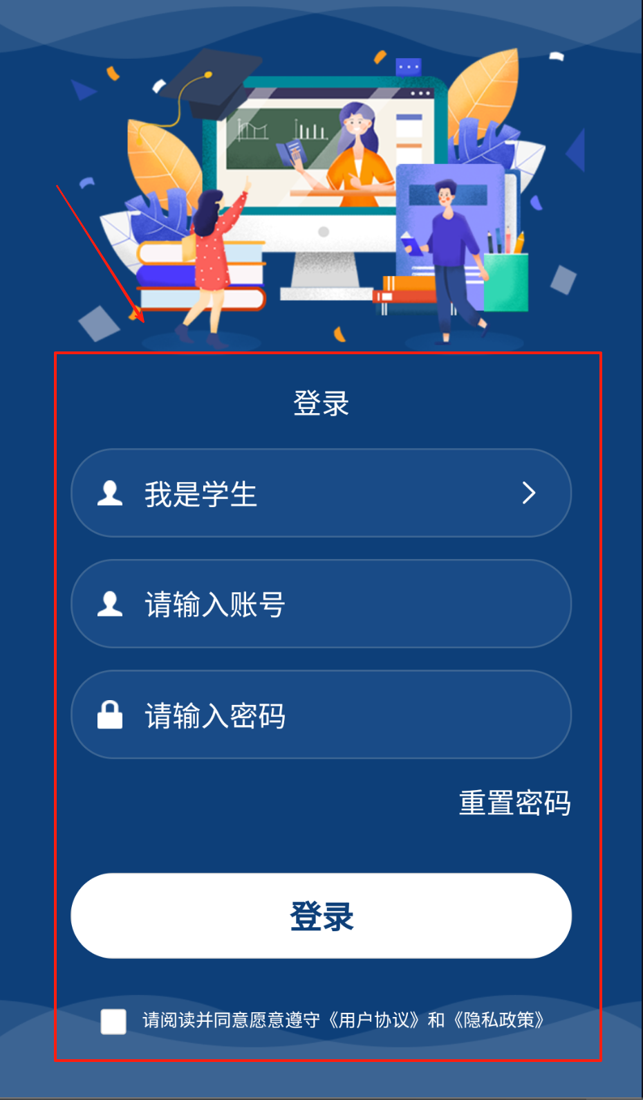 2、登录界面选择学生身份并输入账号密码,勾选底部协议条款后点击登录按钮,若忘记密码可点击重置密码选项跳转相关页面。