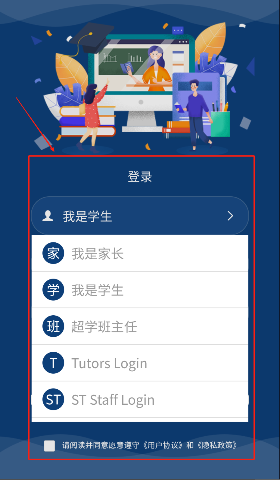 3、根据身份点击对应入口(学生/家长/班主任),完成账号密码填写并勾选同意用户协议与隐私政策,点击登录按钮即可进入主界面。
