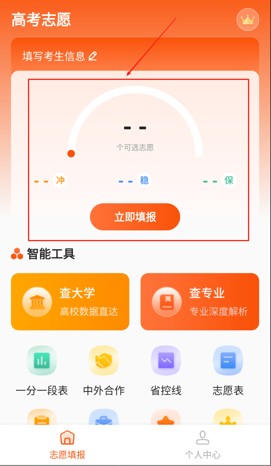 3、输入分数与偏好后使用智能填报功能,系统自动生成梯度志愿方案。