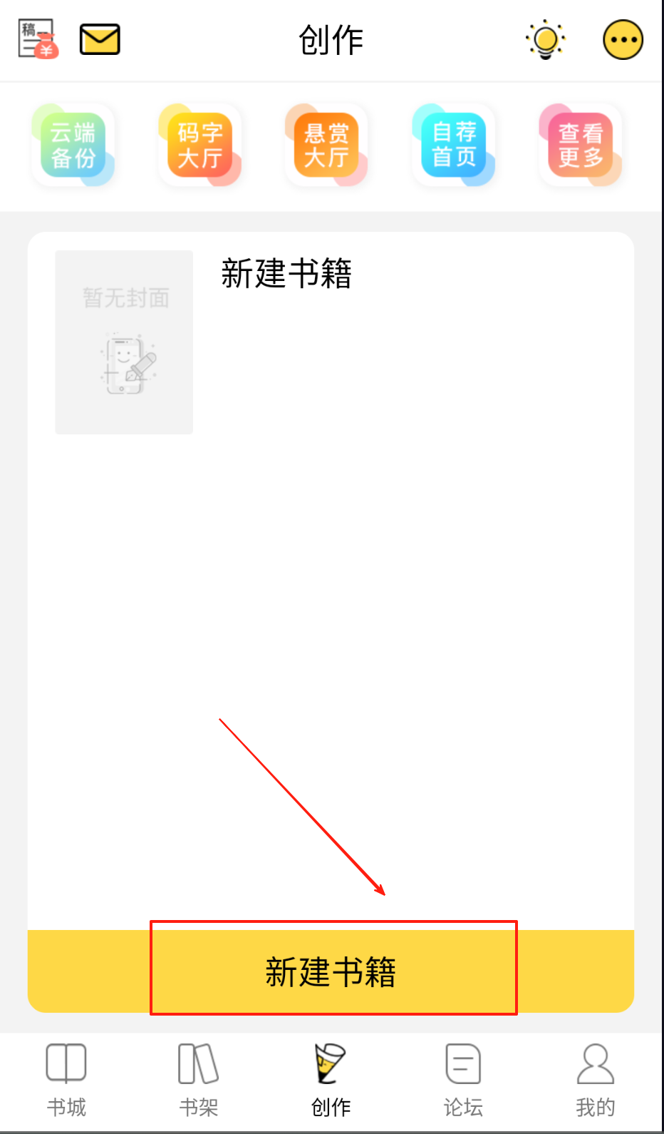 1、首先打开APP,进入软件之后点击底部菜单栏中间的创作选项,切换至创作页面,点击其中的新建书籍按钮。