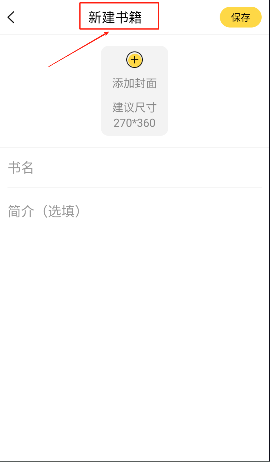 2、开始需要新建书籍,给书籍添加封面,填写书名,填写简介,完成之后点击右上角的保存。