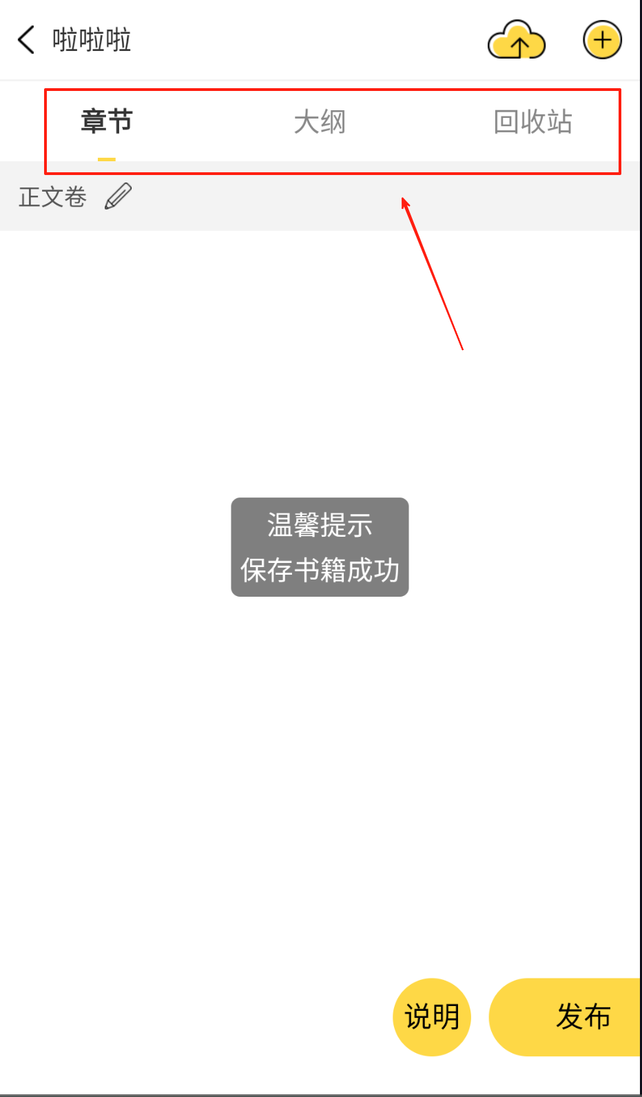 3、然后就可以给小说添加大纲、正文卷、章节了,写完之后还可以实时上传云同步。