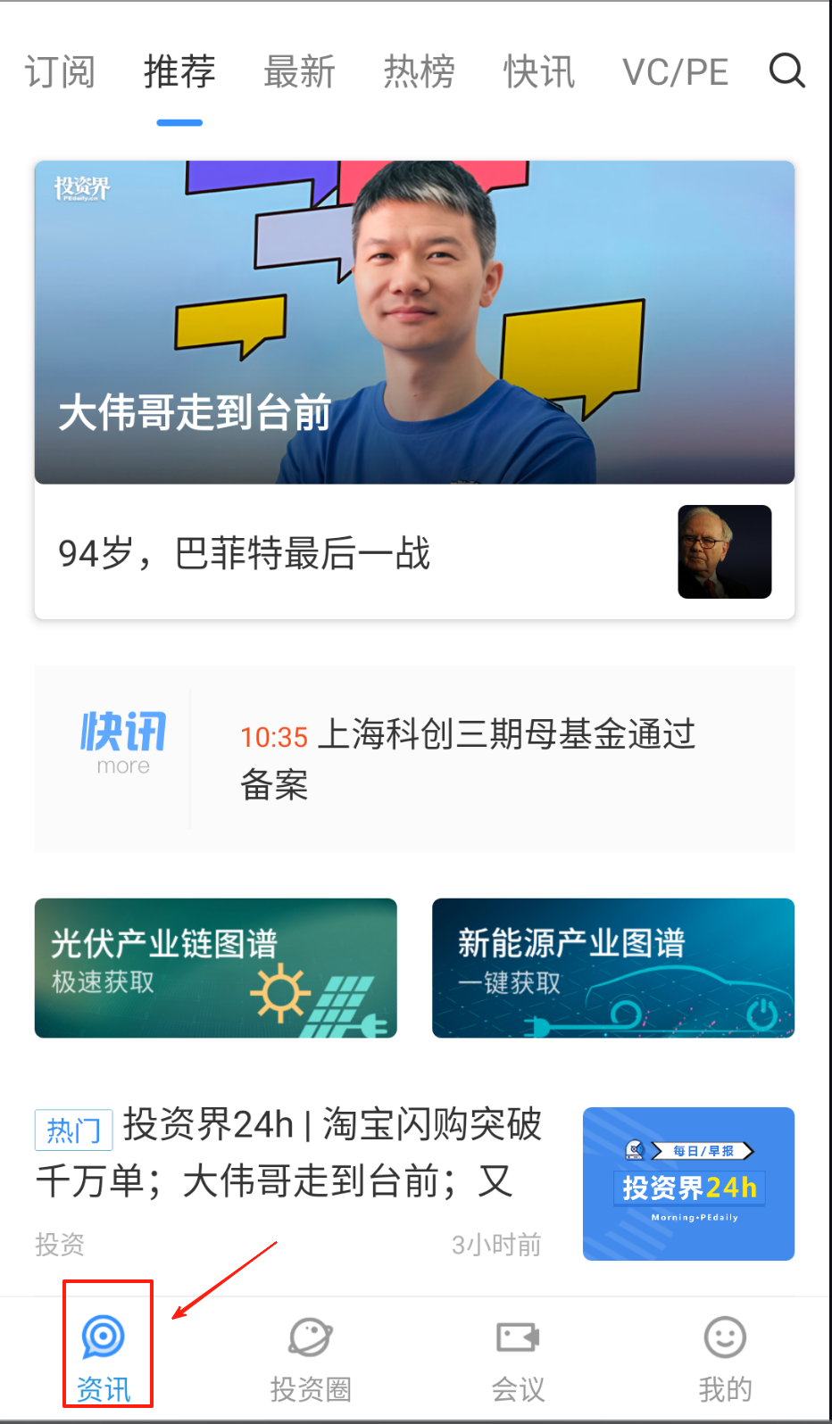 1、注册登录后进入首页,滑动浏览按行业分类的实时投融资快讯。