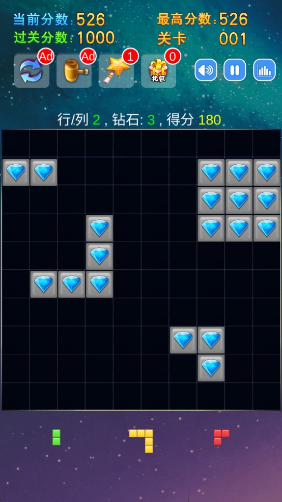 2、创意道具组合:"时间冻结"可暂停方块下落,"颜色转换"能改变宝石属性,"炸弹消除"直接清空指定区域。