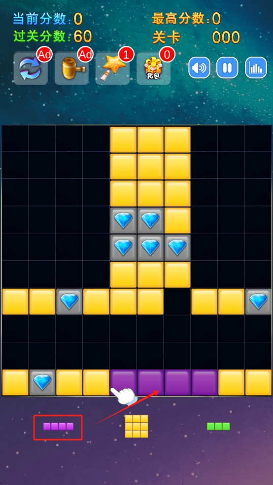 1、基础操作指南:通过左右滑动调整方块位置,上划快速下落,双指点击旋转方块,长按预览下落轨迹。