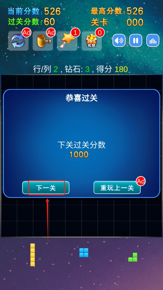 3、完成关卡后点击“下一关”继续游戏。