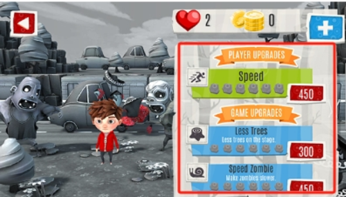 1、3D卡通风格:僵尸逃离采用3D卡通设计,主角色彩鲜艳,场景偏黑白,对比鲜明。