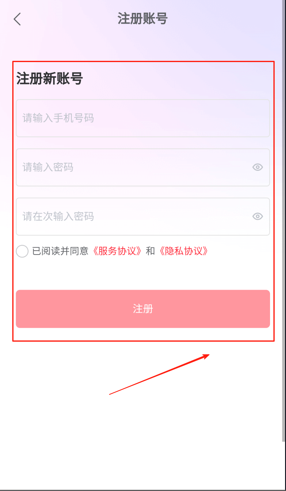 1、打开注册页面输入手机号和密码,点击眼睛图标可检查输入内容,确认无误后勾选底部服务协议选项,最后点击粉色注册按钮完成账号创建。