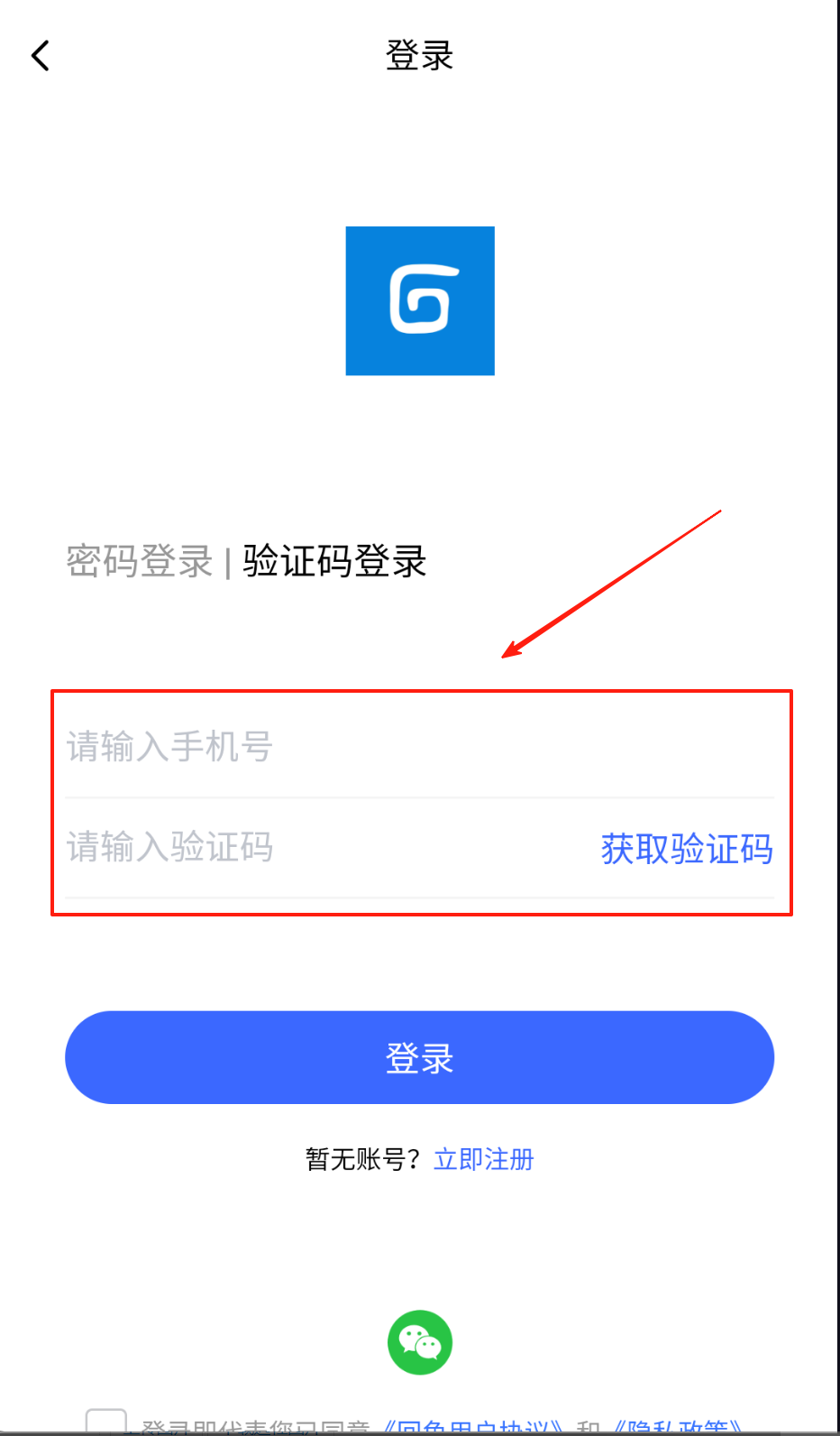 1、打开应用进入登录界面,选择验证码登录方式,在手机号输入框填写正确号码,点击获取验证码按钮等待短信接收。