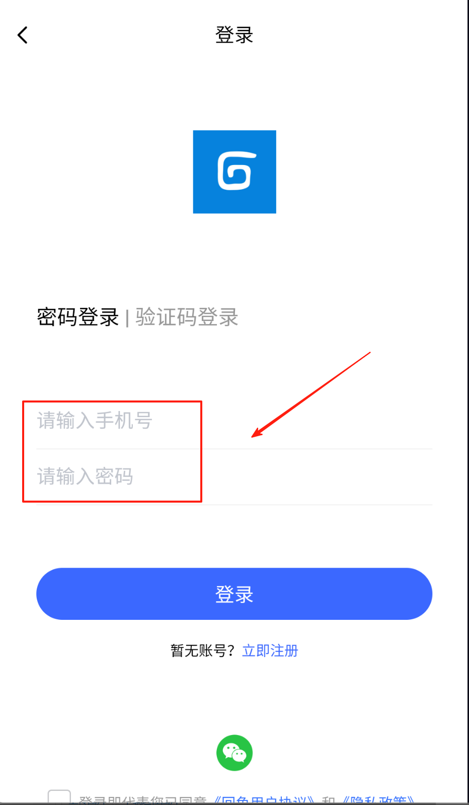 2、若选择密码登录需提前设置账户密码,在登录界面输入注册时使用的手机号码,在密码框输入设定好的字符组合。