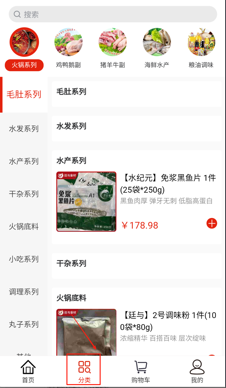 1、点击首页分类标签,滑动浏览不同冻品分区快速定位目标商品类型。