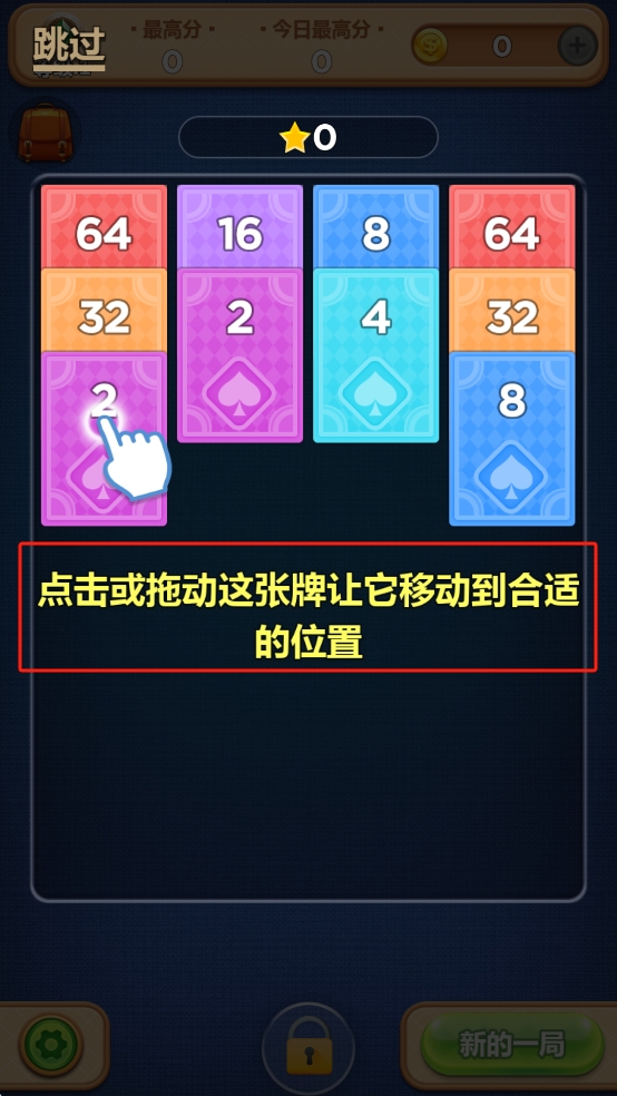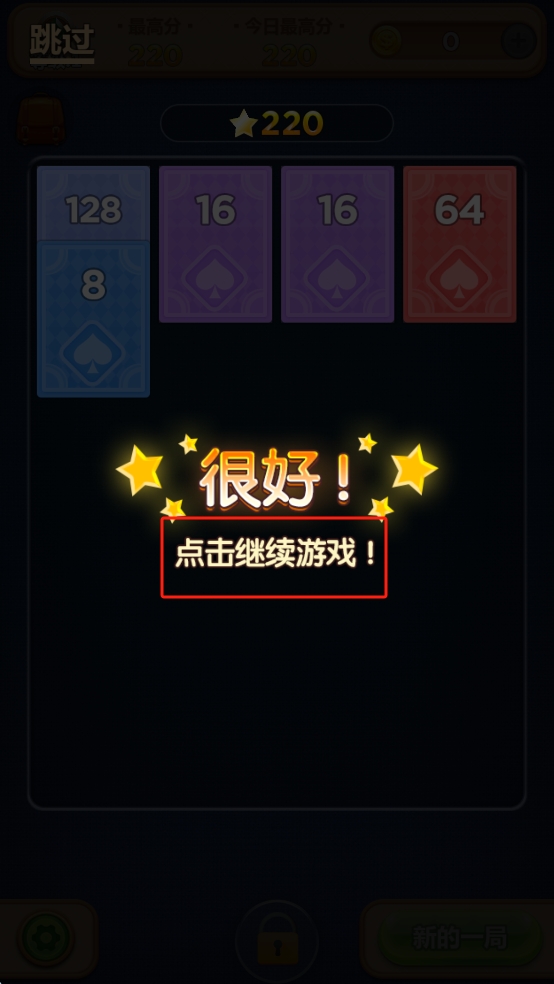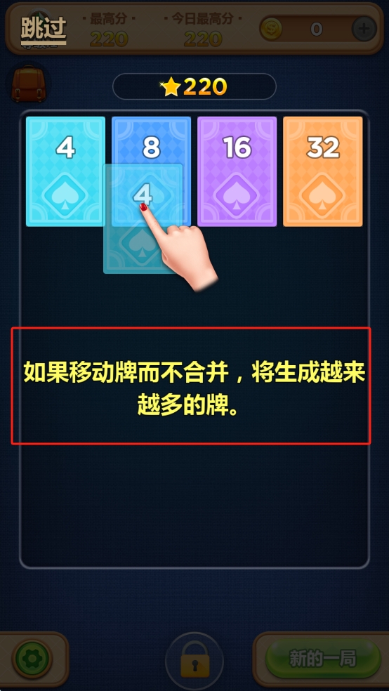 1、基础合并操作:点击两个相同数字的卡牌进行合并,数字会相加形成新卡牌。