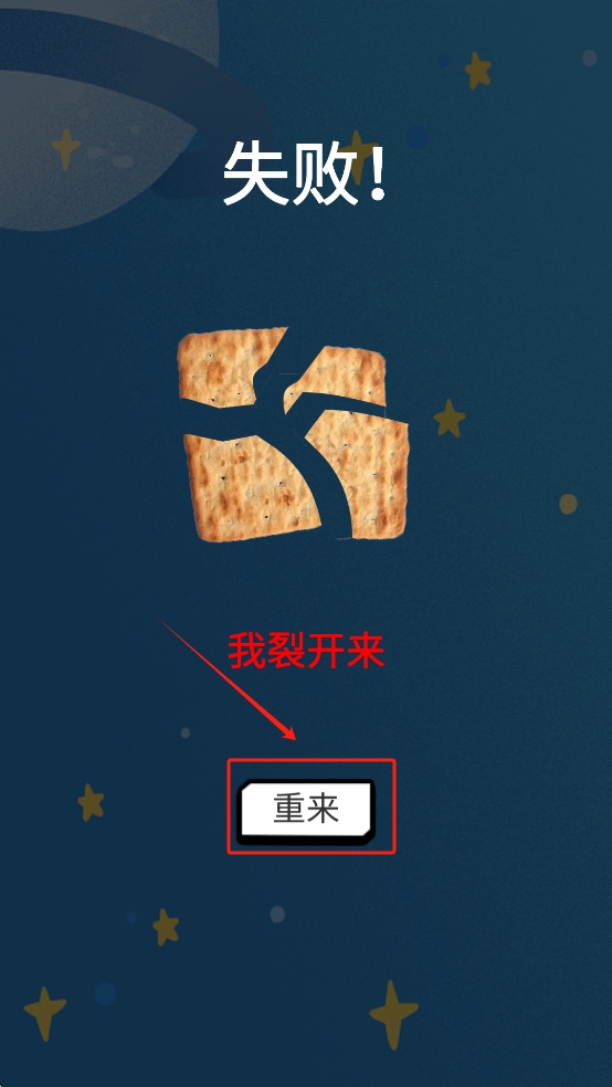 4、如果饼干破裂,游戏失败,点击“重来”按钮重新开始游戏。