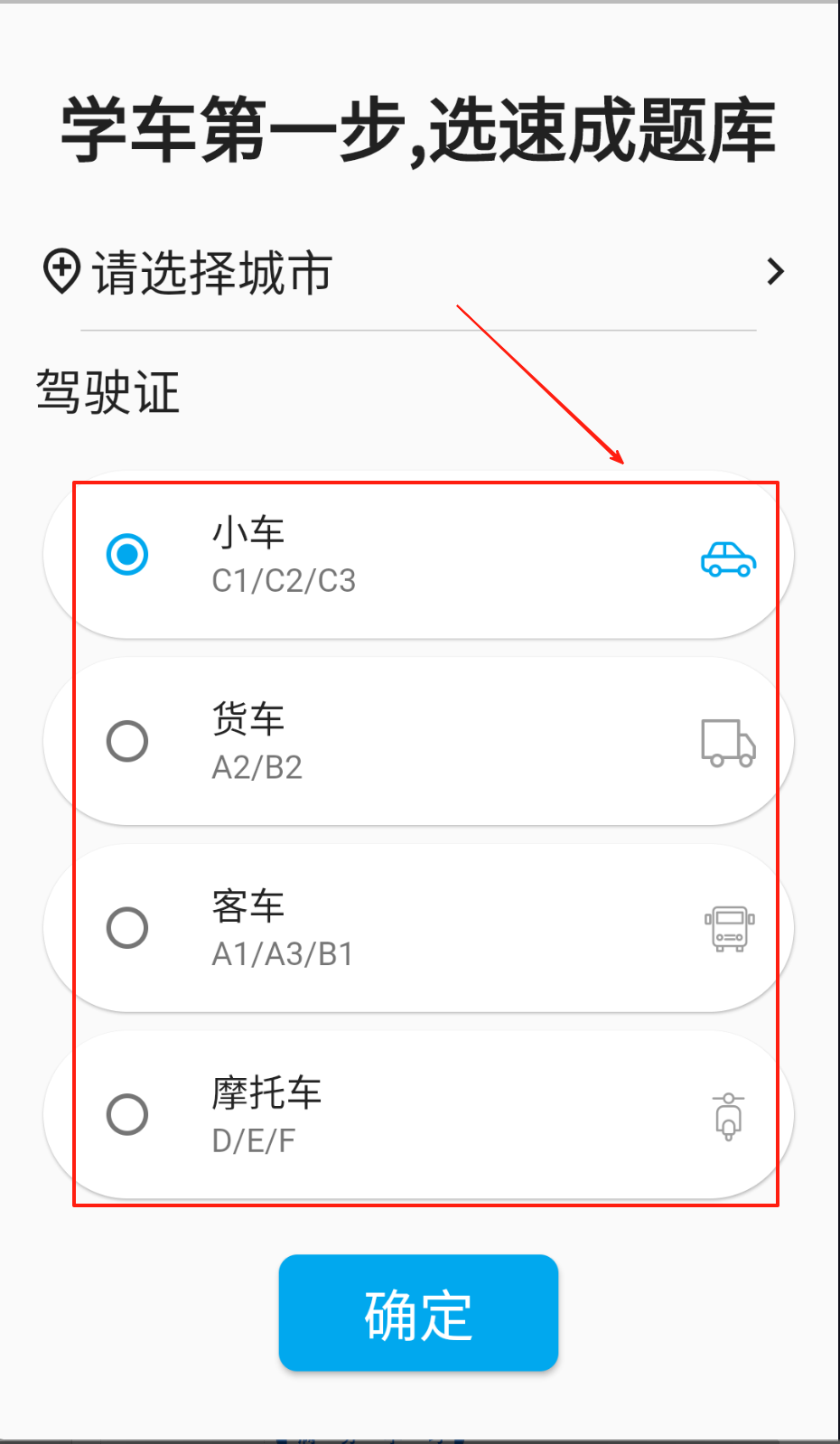 1、进入APP先选对应车型,轿车货车分类练习更有针对性。