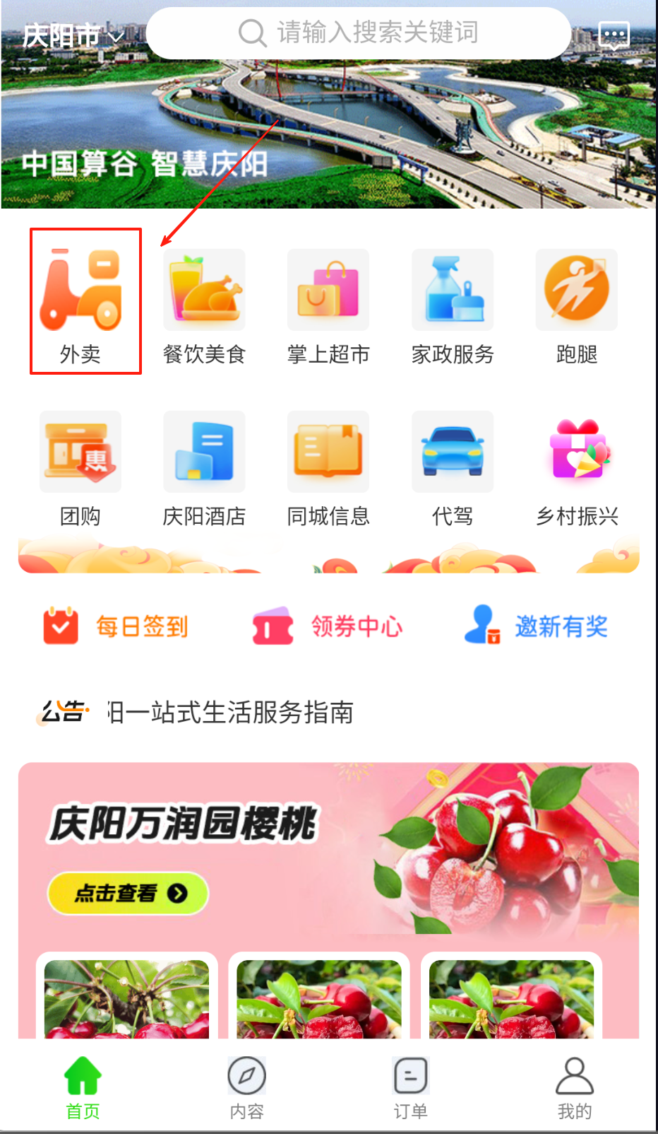 1、进入首页选择外卖服务,浏览附近商家美食,下单后等待配送。