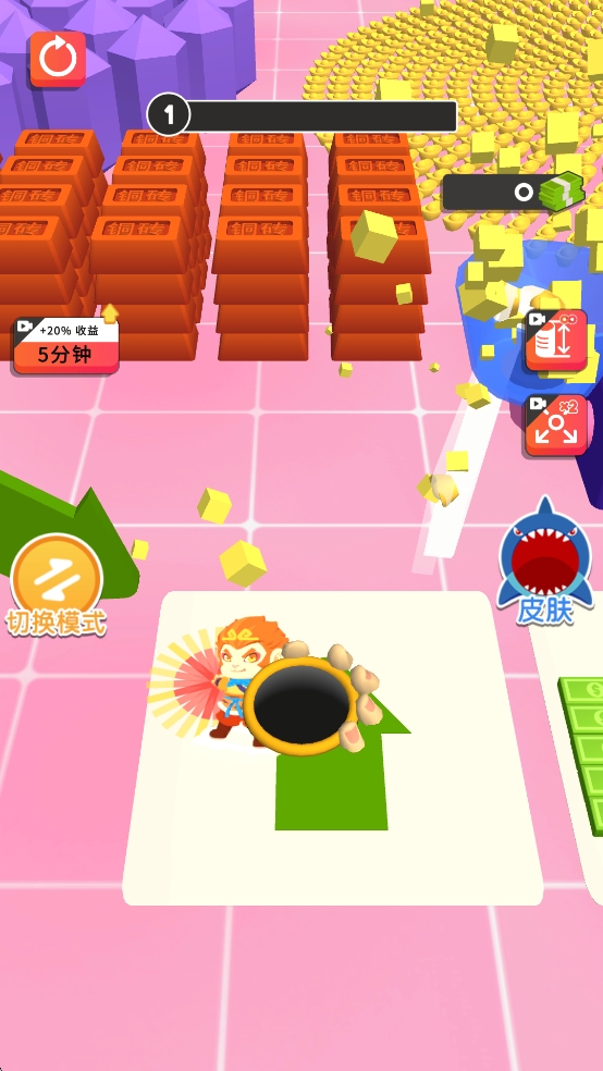 4、前几关只有基础金币,中期加入移动的钞票车,后期会出现需要技巧才能吞噬的保险箱等高级物品。