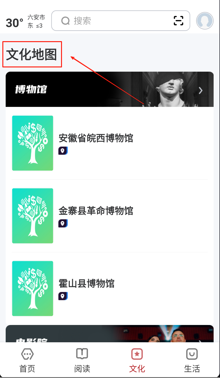2、点击底部导航栏切换至文化地图,输入目标场所名称即可获取导航路线和开放信息。