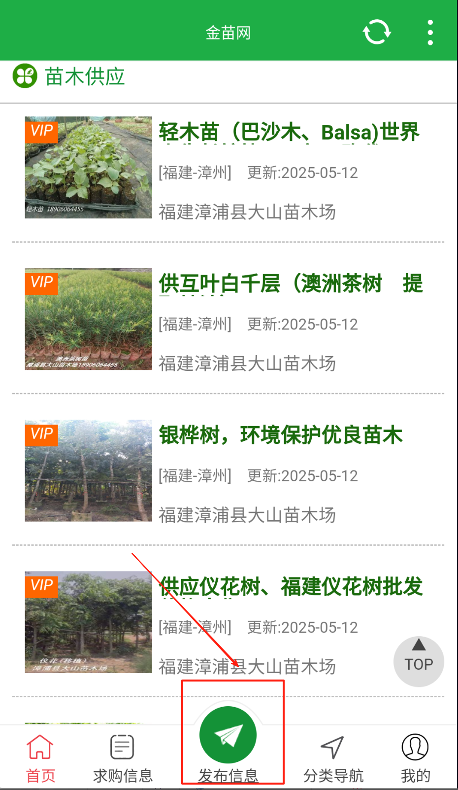 2、点击供求信息板块可浏览最新苗木资讯,按地区分类筛选目标内容。