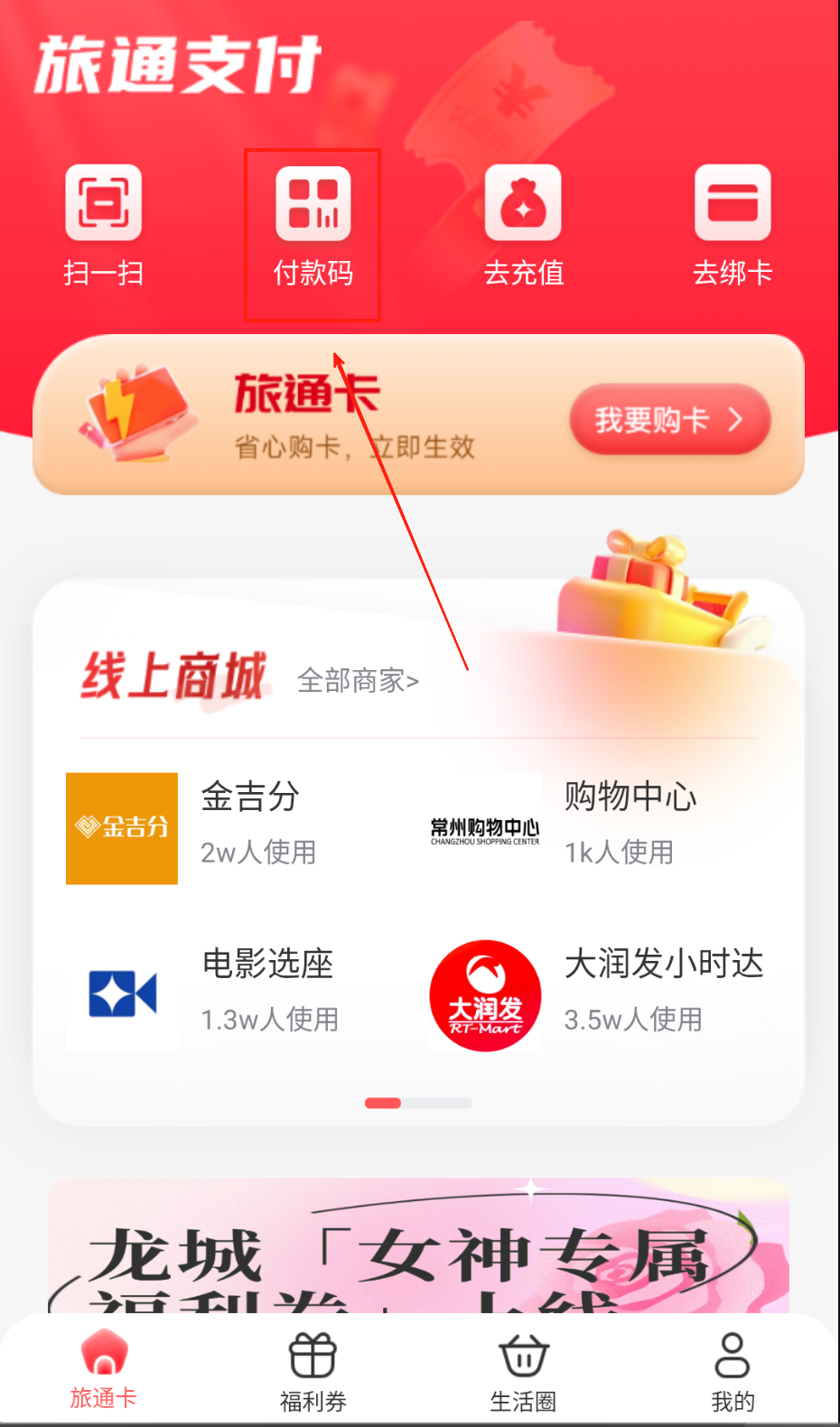 3、消费时调出动态付款码或扫描商户二维码,系统自动优先使用优惠券组合结算。