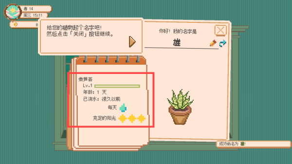 2、给植物起名后,查看植物信息如【崇芦荟Lv.1,年龄:1天,已浇水:很久以前,每天,充足的阳光】,按要求照料植物。