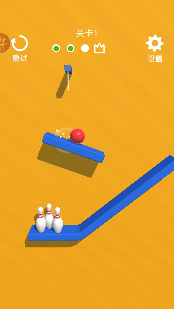 3、精致画面表现:采用明亮卡通画风,保龄球和球瓶造型圆润可爱。碰撞时的粒子效果细腻,绳子断裂的动画流畅自然。