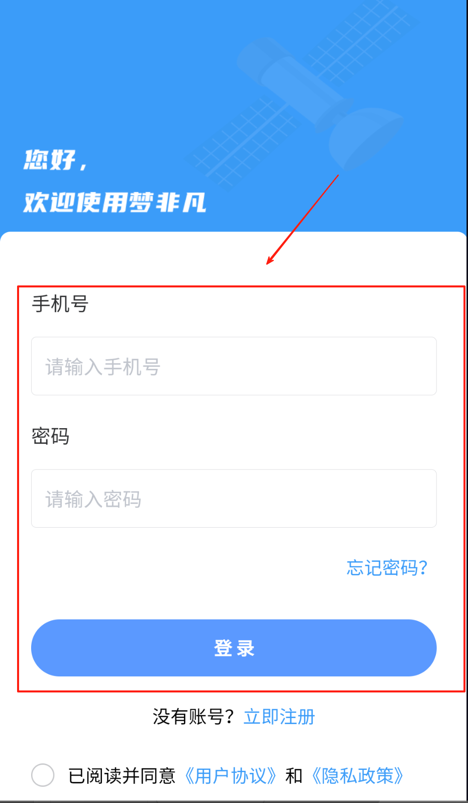 2、登录操作:进入登录页输入已注册的手机号,在密码栏输入对应密码,点击底部蓝色“登录”按钮提交,若忘记密码可点击右下角“忘记密码”链接跳转至找回页面。