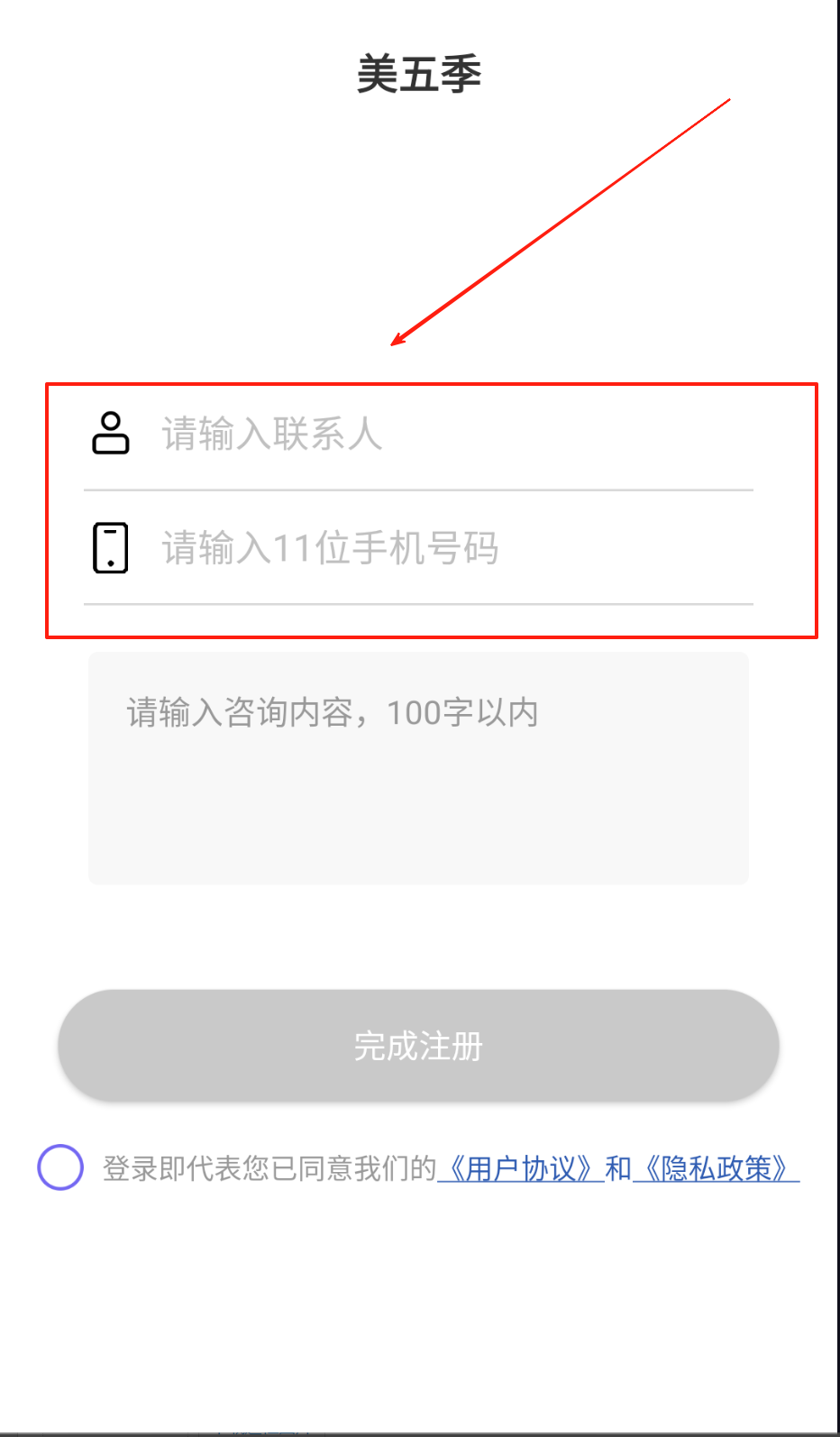 3、填写咨询内容时控制在100字以内,勾选左下角协议条款,确认信息无误后点击蓝色“完成注册”按钮提交申请。