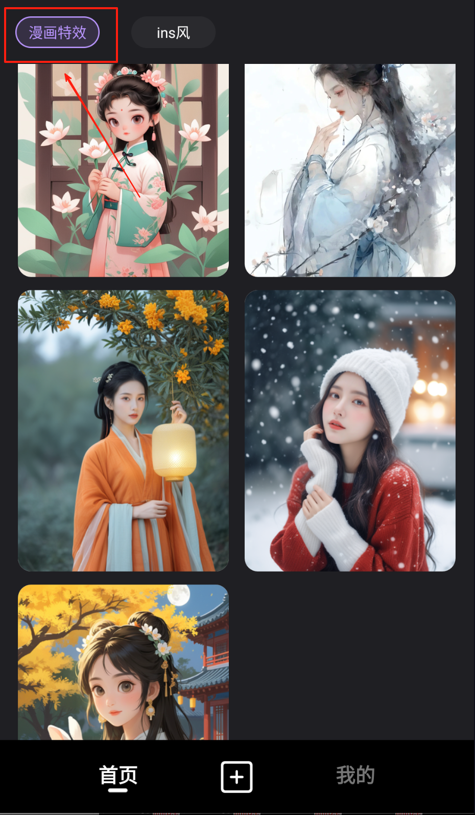 3、进入漫画模式或美妆界面,一键生成二次元形象或添加妆容贴纸。