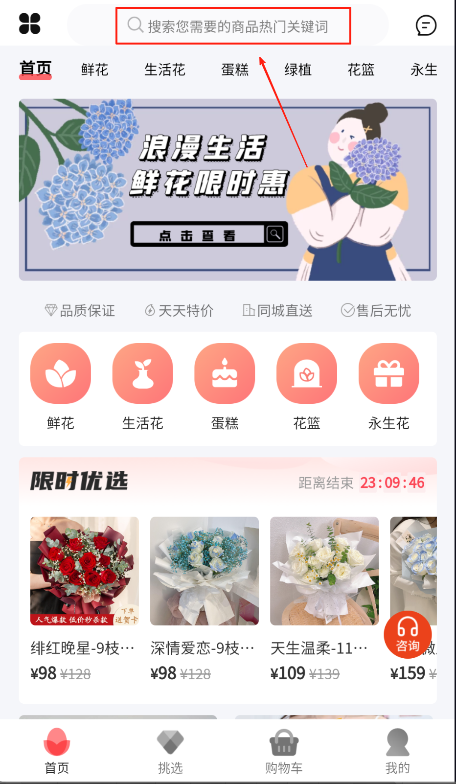 1、下载注册后领取新人礼包,首页浏览热销鲜花和特价专区商品。