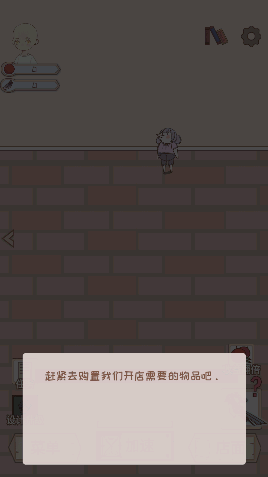1、游戏开始,根据提示【赶紧去购置我们开店需要的物品吧】,明确首要任务是准备开店物资。